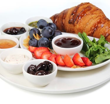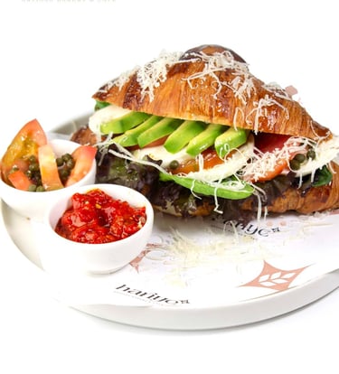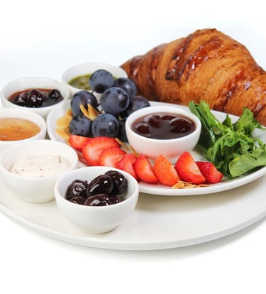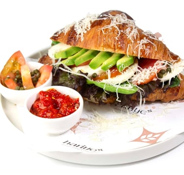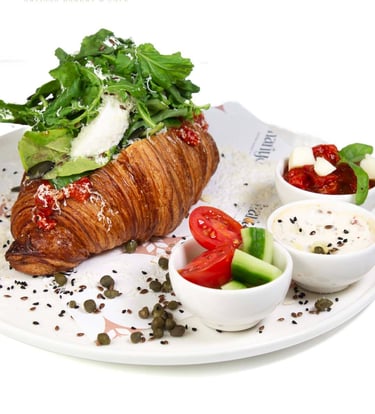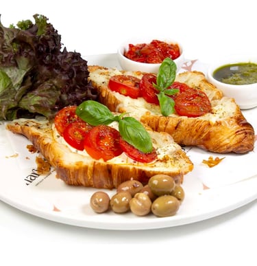 Sade kruvasan, yanında fesleğen, peynir sos, Gemlik zeytini ve mevsime göre değişebilen taze çilek ile sunuluyor; gül, çilek ve vişne reçelleriyle kahvaltınıza tat katıyor.