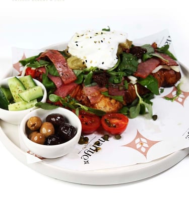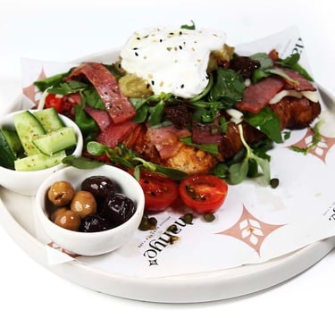 Akdeniz yeşillikleri üzerinde közlenmiş patlıcan, süzme yoğurt, dana jambon, taptaze cherry domates, salatalık ve kırma zeytinle hazırlanmış ferah ve doyurucu bir salata.